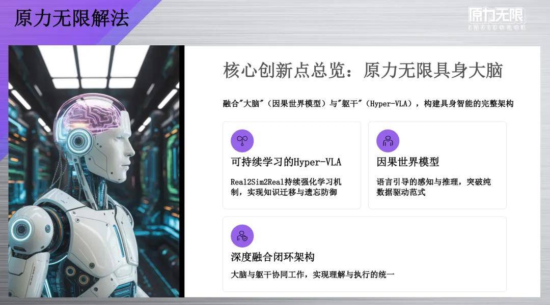 正在明白了方针阶梯后,刘扬犀利地指出了当前支流路径VLA(视觉-言语-动做模子)的内正在局限性。他认为,虽然VLA火热,但其素质上仍是一种数据驱动的、开环的回忆取联系关系模子,这导致三大焦点缺陷。一是闭环能力缺失。施行动做后缺乏对成果的预测取反馈调整,无法构成“-推理-施行”的完整闭环;二是仿实取现实存正在鸿沟。正在仿实中锻炼的策略,难以间接迁徙到复杂多变的实正在物理世界;三是缺乏推理。模子无法进行“反现实揣度”,即理解“若是不如许做,成果会若何”,导致正在动态中顺应性差。“若是没有打通闭环,后面所有要做的泛化和闭环的能力是很难去实现的。”刘扬总结道。这形成了他们所有手艺摸索的起点:必需建立一个能持续进修、具备理解并能不变泛化的闭环系统。基于上述诊断,原力无限规划了彼此联系关系的冲破路径,第一是开辟可持续进修的Hyper-VLA。正在自有Hyper-VLA根本上,成立“Real2Sim2Real”的持续强化进修机制。其焦点是让模子能正在实正在取仿实世界间持续交互、进化,并防止正在进修新使命时遗忘旧技术,实现学问的无效堆集取迁徙。第二是做世界模子(Causal World Model)。冲破纯数据驱动范式,测验考试建立能理解关系的世界模子。通过言语指导取推理,让机械人不只能看、能做,更能理解为什么要这么做,第三是进行VLA取世界模子的深度融合。这并非二选一,而是寻求将VLA的切确施行能力取世界模子的推理泛化能力强拟合。方针是打制一个“大脑”担任推理取规划,“身体”担任精准节制的协同架构,实现闭环自从进化。