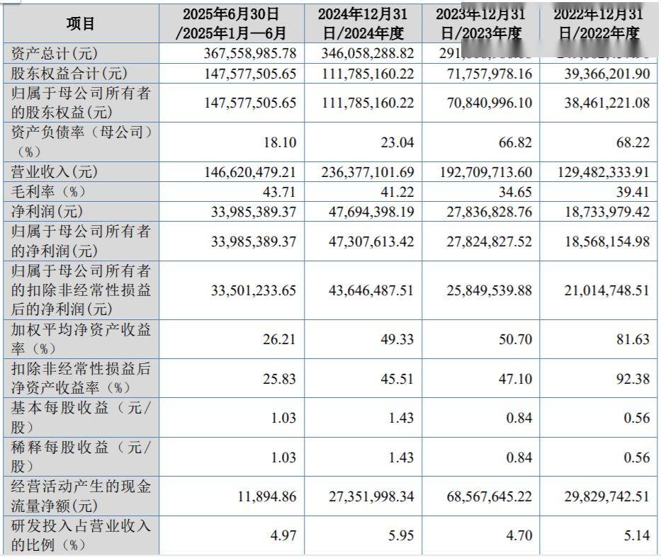 业绩方面,2022年至2024年及2025年上半年(演讲期内),公司停业收入别离为1。29亿元、1。93亿元、2。36亿元和1。47亿元,2782。48万元、4730。76万元和3398。54万元。